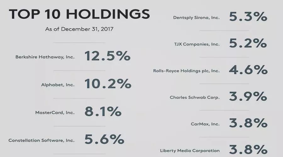 六里在红杉基金的官网上找到其对外公布的持股纪录,清楚地表明比尔·鲁安和他的合伙人里克·卡尼夫(Rick Cuniff),管理着一家高度集中,低周转率的基金,但组合所涉及的领域是广泛多元的,包括银行,医药,汽车,保险,科技等。可以看看截至2017年底基金的前十大重仓。
