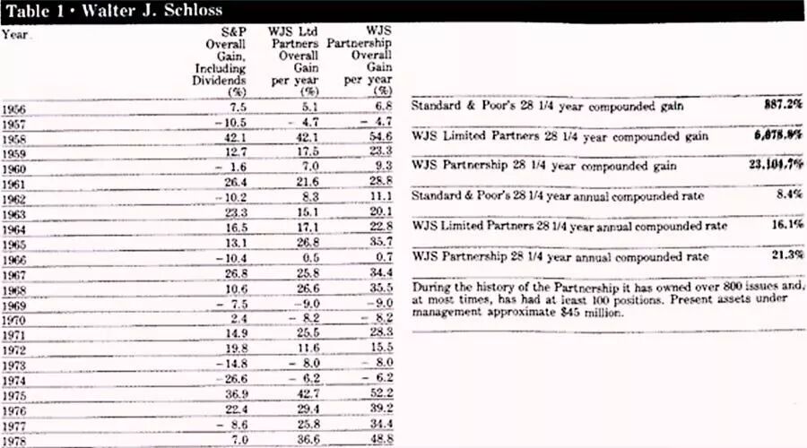 施洛斯自从1956年起经营自己的合伙公司–1984年1季度,28年的年回报率为21.3%,远胜于同期标普的8.7%。而从1956-2002年,47年的年回报率15.3%。