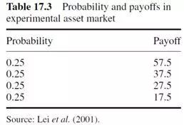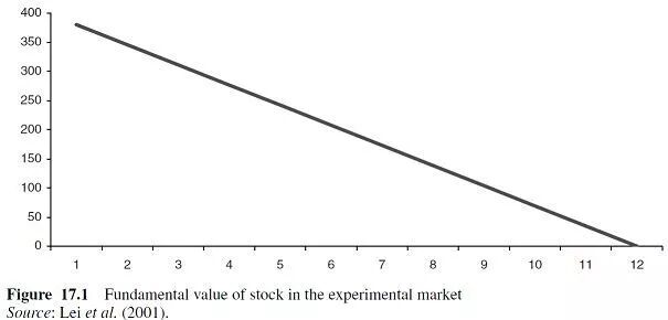 图17.2显示了其中一个资产市场的典型结果。该资产一开始被严重低估,然后大幅上涨至公允价值以上,最后在最后几个时期跌回基本价值。这只不过是一个简单的泡沫形成和破裂。这和行为偏好有什么关系呢?图17.2来自Lei、Noussair和Plott(2001)运行的实验性资产市场的一个特别有趣的版本。
