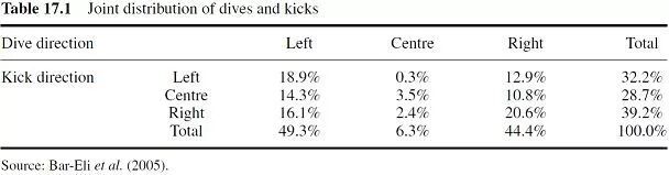 表17.1显示了Bar-Eli等人公布的射门和扑救组合的百分比。非常粗略地说,踢出的球是均匀分布的,大约三分之一的球分别是对准球门的左、中、右。然而,守门员表现出明显的动作偏好,他们要么向左扑救要么向右扑救(94%的几率),几乎从不选择停留在门线的中央。