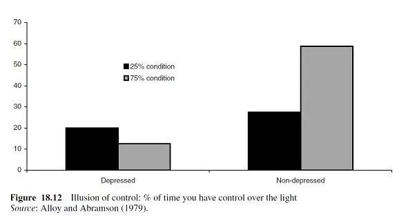 Alloy和Abramson(1979)把参与者放在一个有灯和开关的房间里。在一种情况下,当参与者按下按钮时,有25%的时间是亮着的,而当他们没有按下按钮时,也有25%的时间是亮着的。而在第二种情况下,当参与者按下按钮时,有75%的时间灯是亮的,当他们没有按下按钮时,75%的时间灯也是亮的。