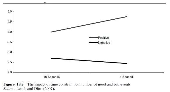 当被允许有时间来考虑这些生活场景时,参与者说6个积极的生活场景中有4个会发生在他们身上,只有2.7个消极的生活场景会发生在他们身上。而在限时的压力下,积极生活场景的数量上升到4.75,而消极生活场景的数量下降到2.4!这种现象与乐观是本能反应的观点是一致的。