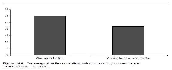 摩尔等人(2002)就是一个很好的例子。他们测试了139名专业审计师。参与者被给予五种不同的审计案例来进行检查。它们涉及财务上许多有争议的方面:例如,一个涉及无形资产的确认,一个涉及收入确认,一个涉及资本化和支出费用。审计员被告知这些案件是相互独立的。审计员被随机分配到为公司工作或为考虑投资该公司的外部投资者工作(图18.6)。