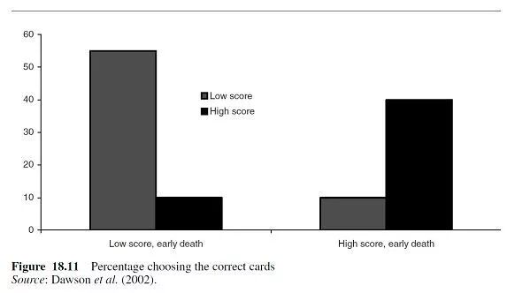 有趣的是,当面临威胁时,人们往往更容易解决问题。例如,在那些得分低的参与者中,55%的人翻出了正确的卡片,而那些得分高的参与者中只有10%的人解决了问题。当告诉高分者这样的分数会导致早逝时,结果正好相反(图18.11)。