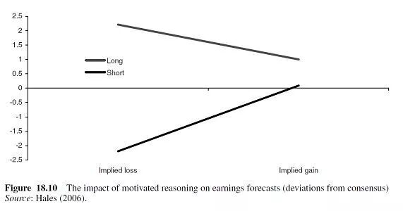 结果表明,投资者对未来收益的预期受到他们愿意相信的东西的影响,尽管他们都有保持预测准确的动机。图18.10显示了结果。当市场一致预期的收益数字意味着参与者将从投资头寸中获利时,他们自己的预测总体上仍与市场一致预期非常接近。