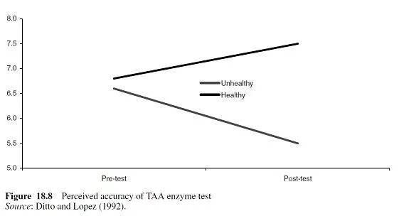 奇怪的是,我们在生活的其他领域也看到了同样的行为。Ditto和Lopez(1992)建立了一个聪明的实验来检验这种行为。参与者被告知他们将接受TAA酶的检测。一些人被告知TAA酶是有益的(即“TAA阳性的人比分泌液中不含TAA的人患胰腺疾病的可能性低10倍”),另一些人被告知TAA是有害的(“患胰腺疾病的可能性高10倍”)。