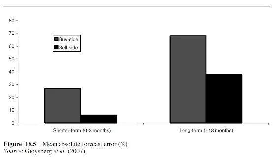 业绩跟踪的时间跨度为两个时间段:短期(0-3个月)和长期(18个月及以上)。结果如图18.5所示。买方分析师远不如卖方分析师准确!短期来看,一般的买方分析师的预测误差为27%,而卖方分析师的预测误差为6%。随着时间的延长,准确的度会变得更差。在18个月的时间范围内,卖方的平均绝对预测误差为38%,买方的平均预测误差为令人吃惊的68% !