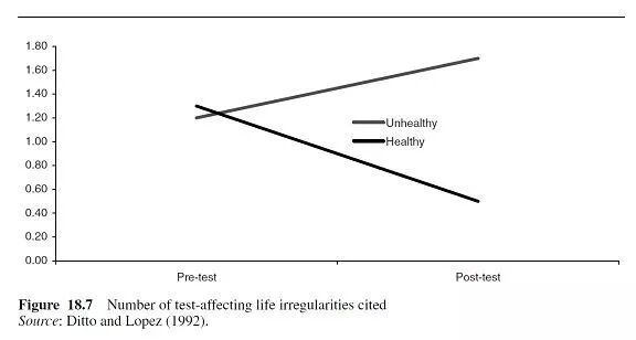 图18.7和18.8显示了Ditto和Lopez发现的结果。在这两个问题中,被告知TAA酶是健康的人和被告知不健康的人给出的答案几乎没有差别,前提是测试发生在他们得知关于TAA是否健康之前。而一旦测试发生在得知TAA健康与否之后,就会观察到巨大的差异。