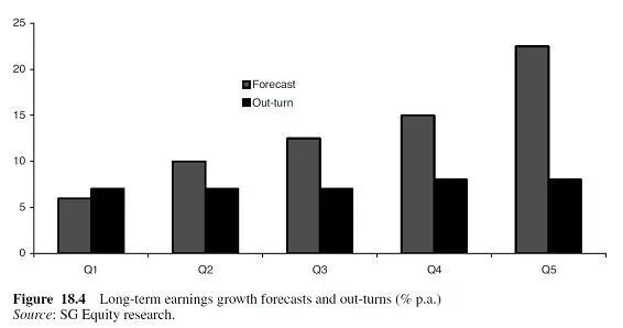 分析师的预测是普遍存在的乐观倾向的又一个例子。图18.4简单地根据分析师对5年预期增长率的看法对股票进行分组。组1的预期增长率最低(年增长率约为6%),而组5的预期增长率最高(年增长率超过22%)。黑色条表示5年后的实际数值。从统计学上看,组1和组5的结果没有差异。