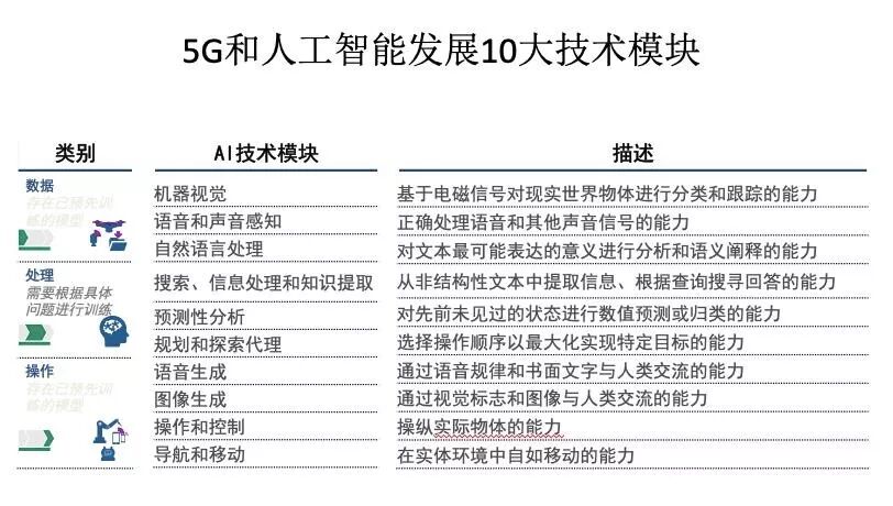 我参与了深圳市政府的人工智能发展战略制定,参观过无数企业之后将人工智能应用总结为10个模块,代表了10种应用技术,都是成型的技术、成型的模块,市场上可以随处买到,只要根据需要进行组合即可。