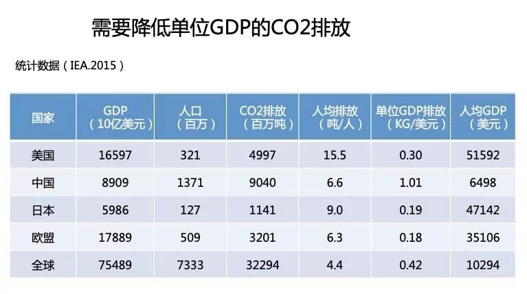 来看中国。从单位GDP的碳排放量来看,中国是日本的5倍,是全球平均水平的2倍。我们现在的目标是中国能走到全球平均水平,为了达到这个目标,我们要减少能源使用、改变能源结构,这也导致了一系列新的行业和产业的诞生。