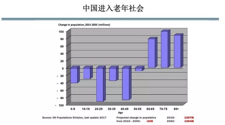 具体到中国,2013年中国进入老龄化社会,今年60岁以上的人口已经达到2.3亿。到2050年增加最多的人口在60岁、70岁、80岁年龄段,60岁以下年龄段的人口全部是净减,减得最多的是40~49岁和20~29岁的人。再往前看15年,2035年的净增人口在60岁和70岁,50岁年龄段的人口在2035年已经开始净减。