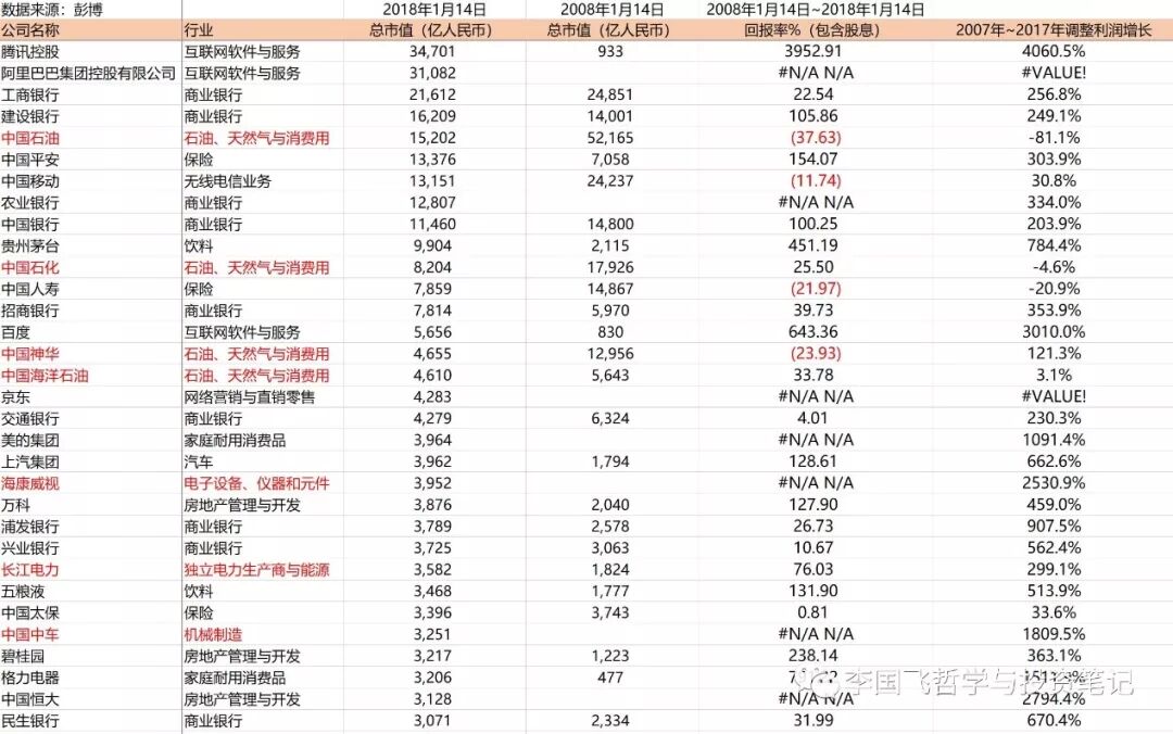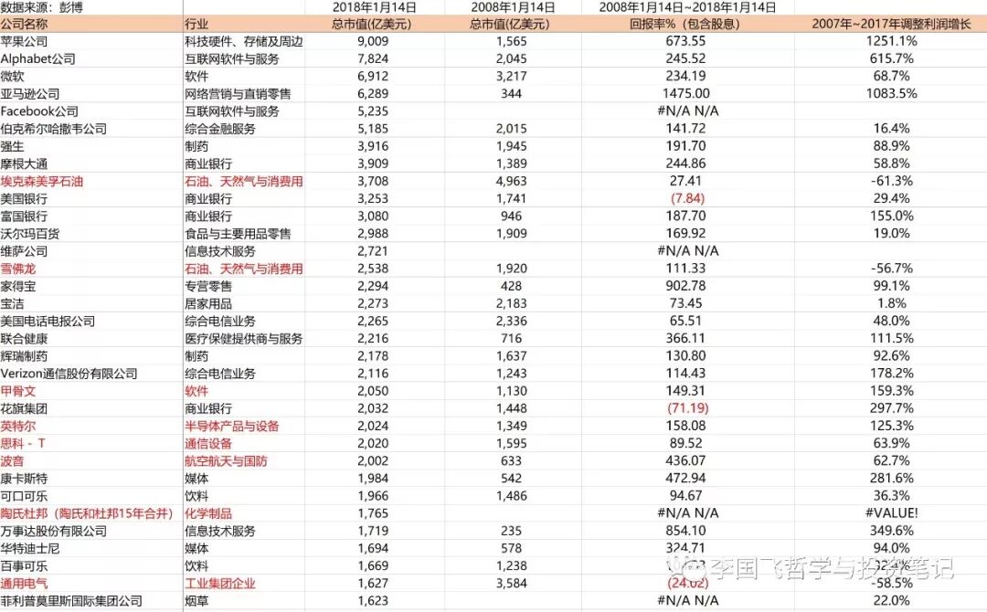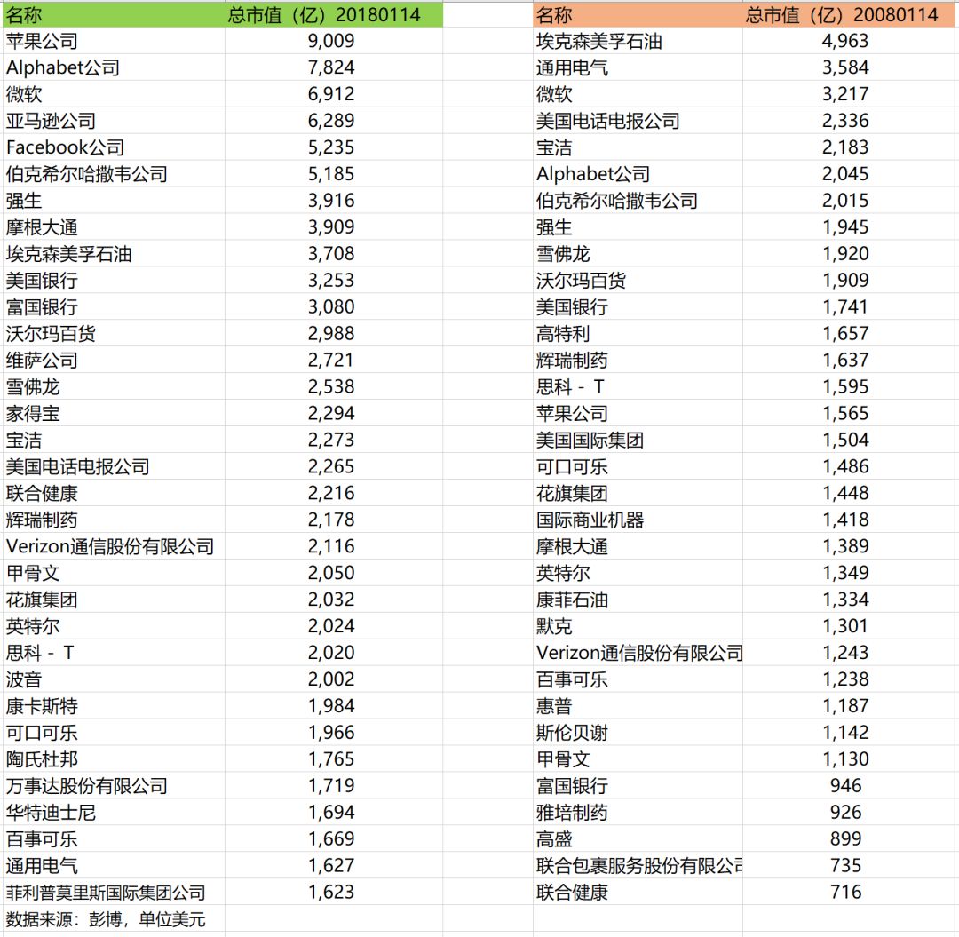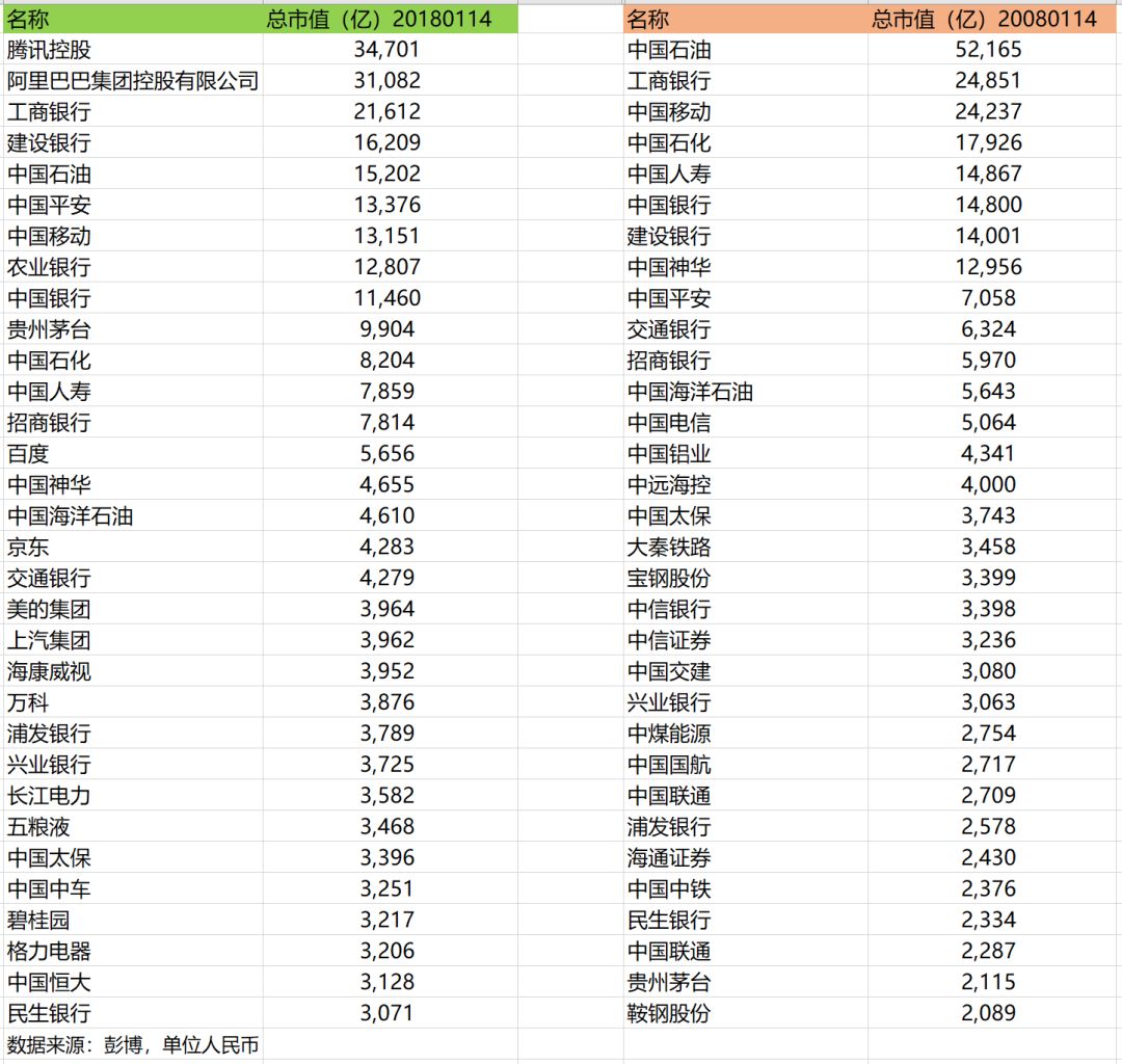 另外,我也查了下这两个国家2008年1月14日,也就是相距十年,市值最大的前三十名公司的市值榜单,并和以上两张榜单的公司作对比(见下两图),有一些不同之处,比较显著的是:两国科技公司市值都在暴增,排名靠前,能源公司业绩普遍大幅滑落,排名下滑较多,美国大金融公司市值增长还不错,尤其是Visa和Master两家信用卡公司,涨得很厉害,而中国金融公司市值普遍停滞不前,只有中国平安表现还算不错。
