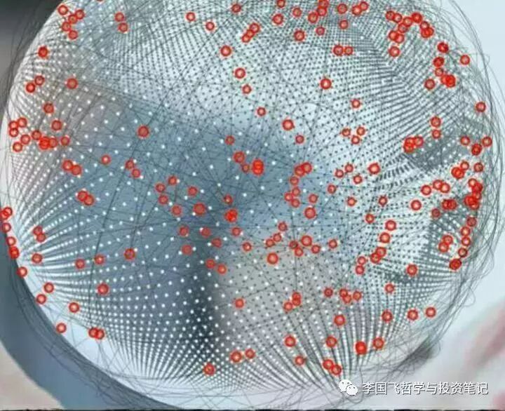为了直观地呈现KK所设想的这个世界的模型,我设计了这样一张图。这张图里,球体代表这个世界,每一个节点代表一个个体,节点不均匀地分布在这个球体上,没有所谓中心的节点,每个节点都不是孤独地存在,而是相互联系的,有强的连接,也有弱的连接,有直接的连接,也有间接的连接,有链条很长的连接,也有链条很短的连接,从而构成千丝万缕的复杂的关系。