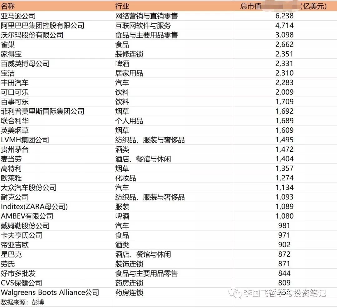 看最新中美市值榜单,前三类公司都是互联网公司、金融公司和消费公司。由于中国处于消费升级的重要阶段,什么样的消费品公司有可能成长为巨头,我统计了全球消费类公司市值的前三十名(日期是2018年1月14日)。