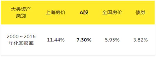 刚才我们分析了美国的情况。我们尝试分析我们国家的情况,从2000年开始到现在,过去十几年,房地产开始兴旺,股市也是牛市;也从2000年开始,中国在加杠杆,资产在证券化。从大类资产配置来讲,作为一般投资者能买到的东西,我们算算17年来中国各类资产的回报,上海的房价,这个是我们花很大的精力算出来的,年化收益率是11.4%,比较贴近实际情况的。股票,以最为客观的万得全A指数反映的全部A股回报率年化7.3%;全国的房价接近6%;债券3.82%(图3)。虽然说过去17年A股大幅波动,是十分幼稚、十分不成熟的市场,但是它实际上提供了仅低于一线房价的长期投资回报率,这就告诉了我们,国内投资大类资产配置应该配什么。当然,几周前,一位做大类资产配置十分成功的机构投资者和我们私下交流,他提到,还有另外一些东西比房价涨得更好,类似字画、艺术品、古董等。但无论如何,过去17年股票是不赖的投资。