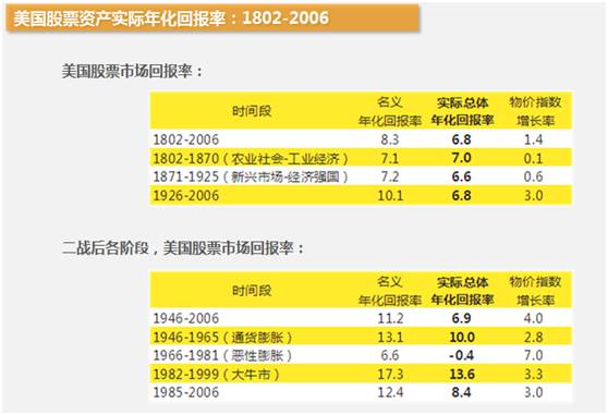 书中尝试分解了不同阶段的盈利情况,这里列出不同阶段(图2),大家可以看到美国经济的发展历程,怎样从新经济变成世界经济强国的,还有二战之后不同阶段的情况。我觉得,作为普通股票投资者要克服贪婪与恐惧,以百年的情况来看,跑赢指数收益的人是少部分,在200年时间里,股票名义年化回报率是8.3%,但是通胀是1.4%,实际总体年化回报率是6.8%的水平。二战后每个阶段,除了牛市有超过通胀达到17%的年化,平均都是个位数的年化回报率,这是我们要认识的第一点。第二点是从长周期看,很多东西干扰股票投资,有经济周期的兴衰,有政策变化,有29年美国大萧条、87股灾、2000年科网股泡沫破裂以及后来的2008年全球金融危机等,但是,所有这些对股票的冲击都是暂时的。这张图可以看到,影响股票长期回报最为重要的因素是通货膨胀。