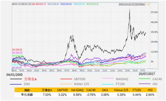 有些事情看远一点会颠覆很多常识,很多人认为过去十几年A股跑不赢纳斯达克,甚至有些人觉得跑不赢港股。我们下面做了比较,过去17.5年,在全球重要的股票市场里面,A股的年化收益率是最高的(图5)。