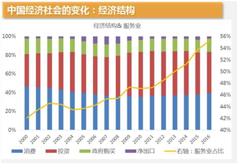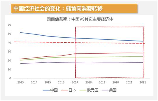 考虑一年的投资决策,当期经济的波动和变化十分重要,我们要分析。但是从10年长周期去考虑,更应该看到的是这个社会发生的长周期结构性的变化。一是经济结构的变化,从2000年到现在,服务业经济占比从42%变成55%(图12),同样的是消费、投资、出口这样的大周期。今年十分热闹的是关于中国经济新周期的争论,看完后面几张图,作为投资者应该会得出比较朴素的结论。我们不太可能再有一波靠固定投资所推动的经济增长周期,我和我的研究员聊,中国这块土地上已经铺了太多的钢铁水泥。这张图(图13)验证了我们对经济长周期的判断,和日本、美国、欧元区比较,中国储蓄率很高,日本曾经也是储蓄率很高的国家,最后大家拿钱买国债。但中国的储蓄率从2011年开始下降,未来会怎么样?现实情况可能会比我们画出来的这条线更加陡峭,我们的储蓄率以更快的速度下降。