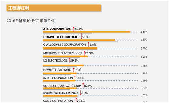 这是PCT(国际专利合作协定)的份额和每年的增长速度,去年中国排在第三位,比第一位的美国差了5%点多,第二位日本差不到1%;但是增长,去年我们PCT的增长超过40%,美国稍微下降,日本只有2%点多的增长。由于存在大学生红利,工程师红利,我们的专利不断增长。落实到企业,过去中国的专利是由高校申请的,现在这张图是全球去年前十大的PCT申请的企业,前面两个是中国的企业,中兴通讯和华为,中兴通讯在布局他的5G,他申请了很多专利,翻了一番。