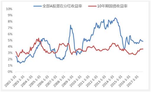 图4:A股潜在分红收益率VS国债收益率(2002年至今)